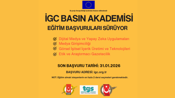 İzmir Gazeteciler Cemiyeti (İGC)’nin Türkiye Gazeteciler Sendikası ve Gazeteciler Cemiyeti ile birlikte yürüttüğü ‘Medya Özgürlüğüne Destek-Güçlü Dayanışma Güçlü Medya Projesi’ kapsamında 2026 yılı İGC Basın Akademisi eğitimleri 2 Şubat’ta başlıyor.