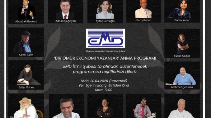 Ekonomi Muhabirleri Derneği İzmir Şubesi’nin gelenekselleşen “Bir Ömür Ekonomi Yazanlar” anma etkinliği 20 Nisan 2026 Pazartesi günü saat 12:00’de Ege İhracatçı Birlikleri önünde pilav hayrı şeklinde gerçekleştirilecek.
